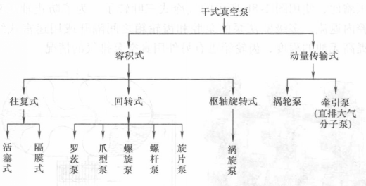 現(xiàn)在市場上提供的干式真空泵種類很多??煞譃閮深悾喝莘e式和動量傳輸式。容積式無油真空泵,如多級羅茨泵、爪型泵、往復(fù)式活塞泵、螺桿式泵和渦旋式泵等。這種干式泵的極限壓力一般為0.1~10Pa,抽速為0.01~0.04m3/s。動量傳輸式的無油真空泵,如渦輪式無油泵。排氣側(cè)與大氣相接,在連續(xù)流狀態(tài)下壓縮比較高。它是一種粗抽泵,可從標準大氣壓抽到10-2Pa。在結(jié)構(gòu)上采用徑向和周向流泵的復(fù)合式結(jié)構(gòu),多級串聯(lián)取氣。這種泵的極限壓力約為10-2Pa,抽速為0.02~0.15m3/s。