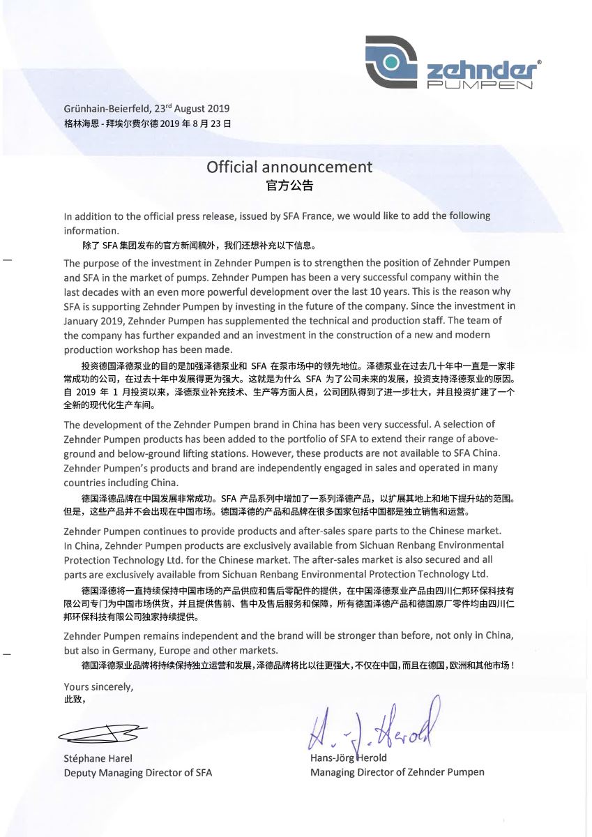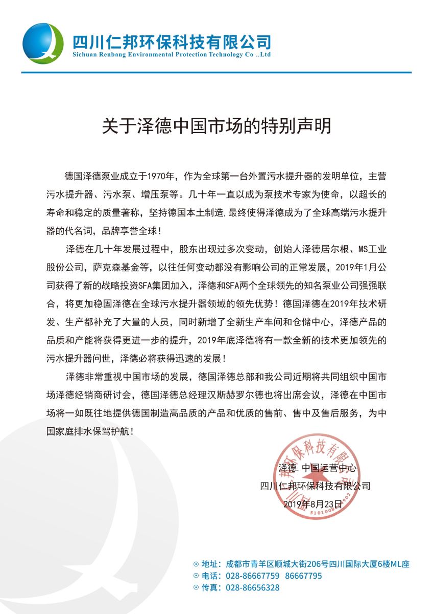 近期中國(guó)污水提升市場(chǎng)一些別有用心之人,捏造事實(shí),虛假造謠,蠱惑欺騙客戶。針對(duì)中國(guó)市場(chǎng),德國(guó)澤德總部和仁邦公司聯(lián)合做出以下聲明文件,同時(shí)對(duì)一些虛假造謠之人,保留追究法律責(zé)任的權(quán)力,特此聲明!